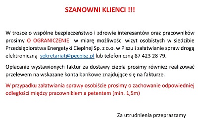 Przedsiębiorstwo Energetyki Cieplnej Sp. z o.o. w Piszu informuje, że w wyniku drugiego naboru ofert ogłoszonego w dniu 18.03.2020 roku na sprzedaż ładowarki teleskopowej w wyznaczonym terminie wpłynęło jedenaście ofert: (więcej…)