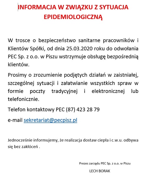 Przedsiębiorstwo Energetyki Cieplnej Sp. z o.o. w Piszu informuje, że postępowanie w trybie naboru ofert ogłoszone w dniu 17.03.2020 roku, na opracowanie wniosków aplikacyjnych zostaje unieważnione. Zgodnie z punktem XIII ogłoszenia. Następne postępowanie zostanie ogłoszone w najbliższym czasie.